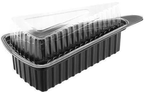 Упаковка для куска торта, пирога или пирожных треугольной формы. Контейнер имеет прочное дно черного цвета, которое держит форму и не позволяет деформироваться кондитерскому изделию во время перевозки, а прозрачная крышка позволяет покупателям легко рассмотреть продукт без вскрытия упаковки и нарушения ее целостности. Размер комплекта 177мм*96мм*64мм. Изготовлен из материала БОПС (биаксиально-ориентированный полистирол).