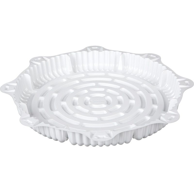 Круглый контейнер для тортов и кондитерских изделий с размерами внутренними: диаметр - 338мм, высота -150мм. Внешний диаметр -455. Внешняя высота -168мм. Контейнер состоит из дна белого цвета и прозрачной крышки.Крышка изготовлена из биаксиально-ориентированного полистирола (БОПС). Изделия из данного материала обладают прекрасной прозрачностью, что позволяет рассмотреть продукт внутри упаковки. Крышка имеет ребристую поверхность.Наличие ребер не препятствует обзору. Верх крышки плоский, это позволяет разместить информацию (этикетка, стикер, печать). Круглое дно изготовлено из полистирола. Поверхность дна имеет ребристость, что препятствует перемещению продукта внутри контейнера и обеспечивает целостность кондитерского изделия. Крышка фиксируется ко дну благодаря 8 кнопочным замкам
