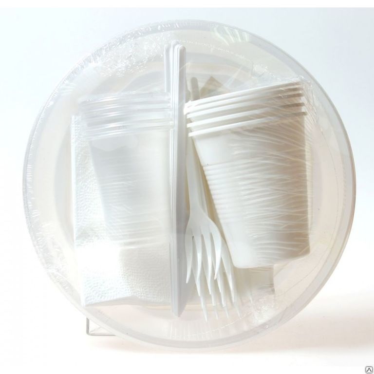 Стакан 200мл (5шт.) Тарелка десертная (5шт.) Вилка (5шт.) Нож (5шт.) Салфетка белая (5шт.) Забочистка в упаковке (5шт.)