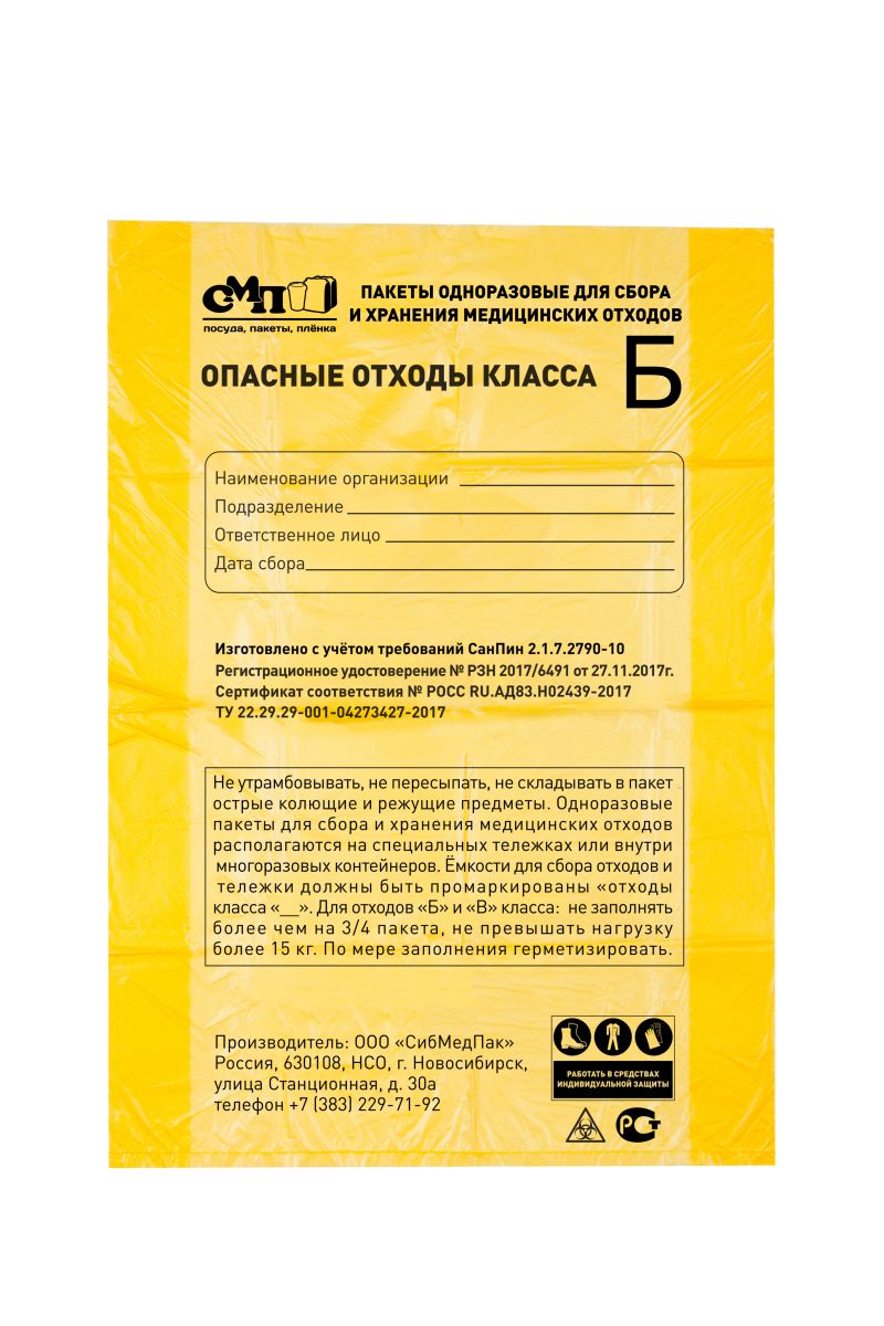 Преимущества товара: Мешки для отходов Б класса – желтый (опасные, рискованные). В эту группу входят объекты утилизации с потенциальным риском инфицирования. Например, пакеты для мусора Вы можете использовать для пищевых и иных отходов инфекционных отделений, перевязочные и гигиенические материалы, а также лабораторная продукция, представляющая опасность при свободном контакте. На пакете для мед отходов есть окно, для наименования организации, подразделения, ответственного лица и даты сбора, благодаря которому не нужно приобретать отдельно бирку. Применяются пакеты для мед отходов в лабораториях, поликлиниках, больницах, клиниках и косметологии. Продукция сертифицирована, соответствует требованиям СанПин и имеют регистрационное удостоверение.