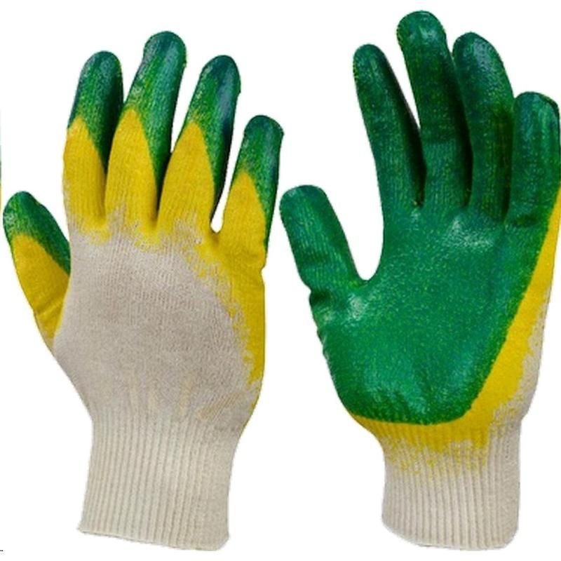 Перчатки х/б с латексом 2-облив (зеленые) - предназначены для работ со скользкими и гладкими поверхностями. Применяются для защиты рук от воздействий внешней среды и общепроизводственных загрязнений (пыли, грязи). Они отлично предохраняют пальцы и ладони от небольших механических повреждений: ссадин, царапин, уколов и т. д.