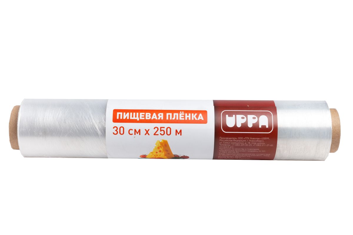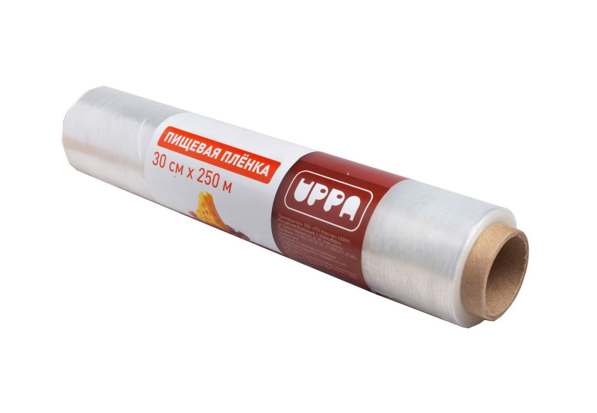 Пищевая стрейч-пленка ПЭ 300x250м с этикеткой – помогает сохранить свойства продуктов, ограждает от внешних воздействий, пропитывания посторонними запахами, высыхания («заветривания»).